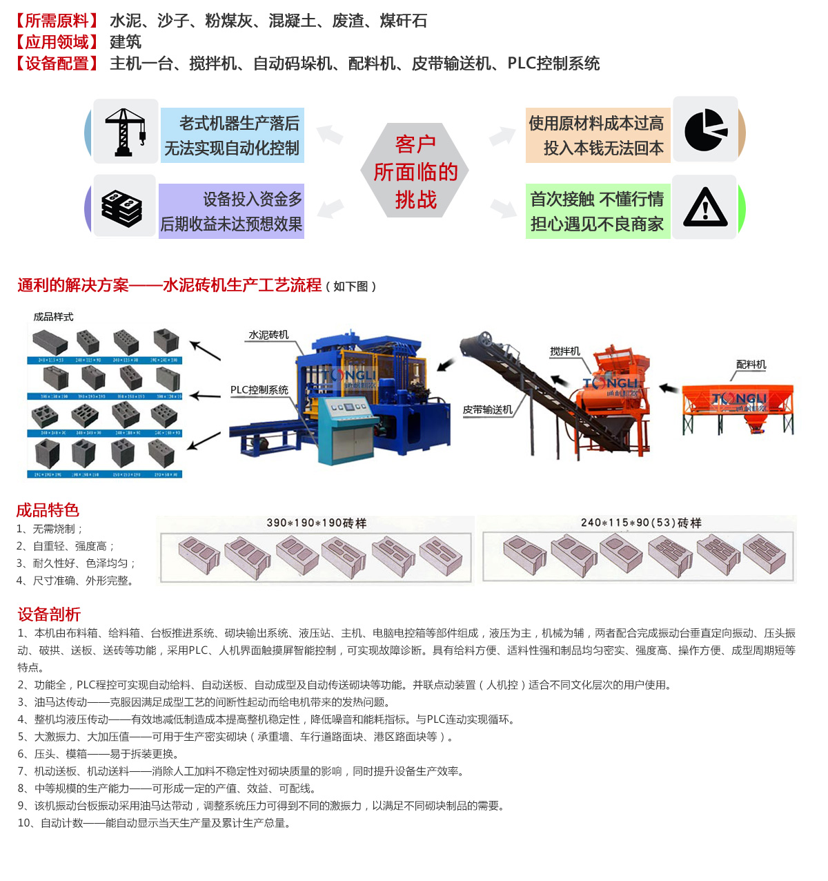 通利免燒磚機(jī)工作原理:設(shè)備材料到位,木板到位時(shí)按啟動(dòng)鍵,送料斗將混凝土料送出,到位后臺(tái)板振動(dòng),作振動(dòng)加料,時(shí)間可調(diào),送料斗作直線往復(fù)運(yùn)動(dòng),同時(shí)破拱機(jī)構(gòu)擺動(dòng)加速下料,布料結(jié)束后,送料斗退回,分料電機(jī)運(yùn)轉(zhuǎn)分料。加料結(jié)束后,壓頭下,所有振動(dòng)器振動(dòng),對(duì)模箱內(nèi)物料加壓振動(dòng),到達(dá)砌塊度時(shí)(度可調(diào)),所有振動(dòng)停,延時(shí)消除余振。起模,到位后,壓頭升,送磚機(jī)將另一木板送上振動(dòng)臺(tái),同時(shí)將已制成的磚,送上砌塊制磚輸送臺(tái),模箱降,即完成一生產(chǎn)周期。整個(gè)動(dòng)作由PLC自動(dòng)控制,若手動(dòng)/自動(dòng)旋鈕處于自動(dòng)位置,按動(dòng)啟動(dòng)鍵,則完成上述各步驟的自動(dòng)循環(huán)。