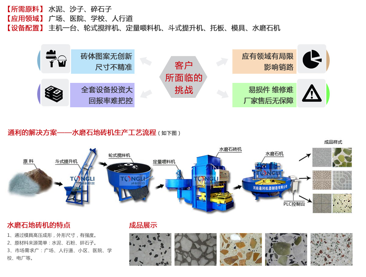 河南通利水磨石地磚機采用機、電、液、氣、光、控于一體,人機界面控制,自檢故障功能齊,之器件配置,延長設(shè)備的使用壽命同時確保設(shè)備的性能發(fā)揮。